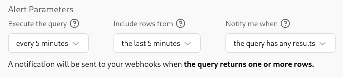 • You can adjust when alerts are sent based upon the alert parameters. With this style of alert, we just want to know if anything within the last 5 minutes has been slow. So we can use the following options: