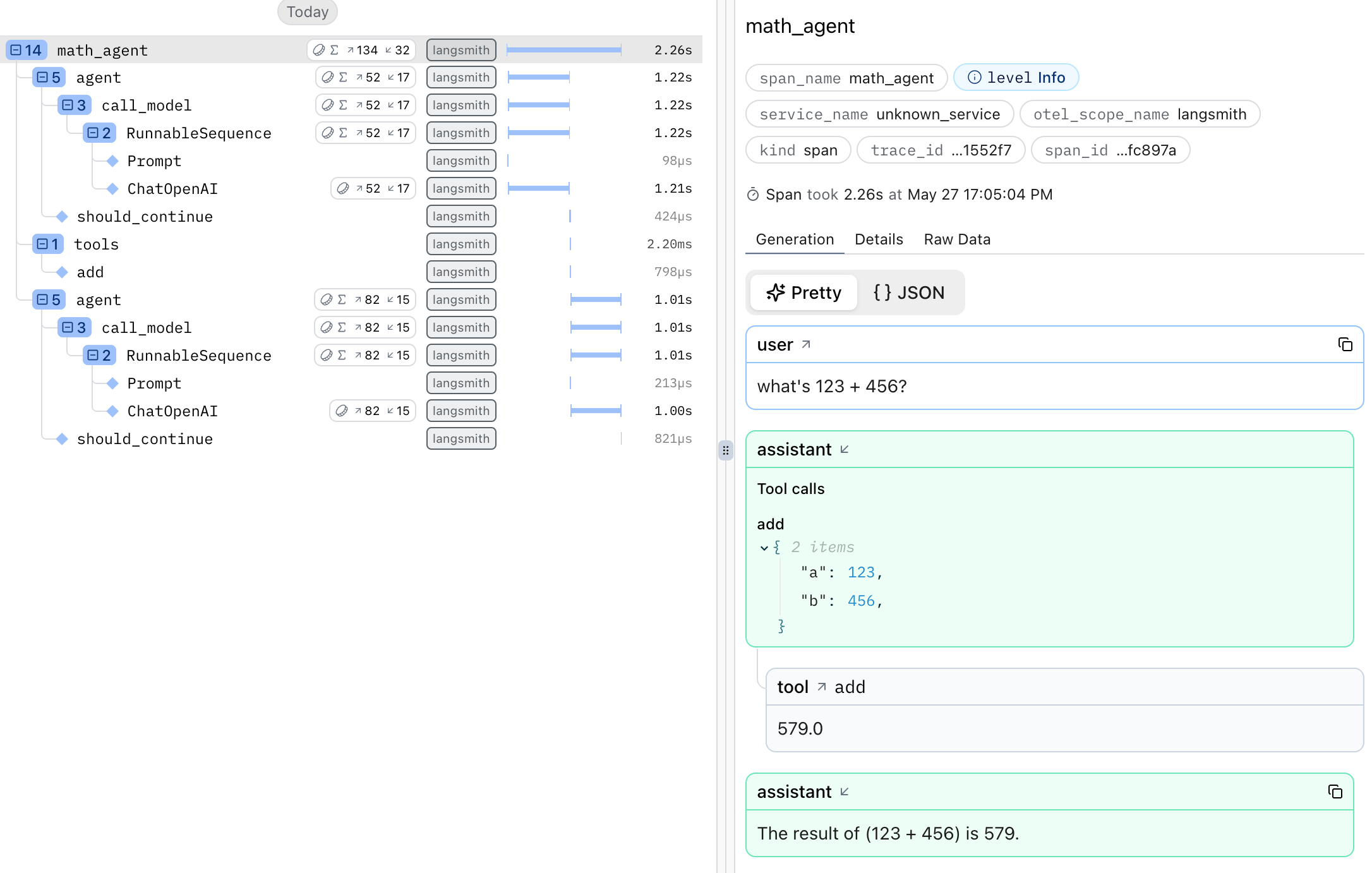 result = math_agent.invoke({'messages': [{'role': 'user', 'content': "what's 123 + 456?"}]})